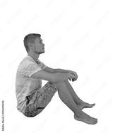 Pensive young man seated down looking up isolated over transparent background. Side view full length portrait thoughtful boy sitting