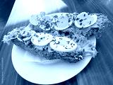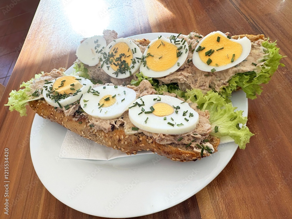 Open-faced tuna sandwich with boiled egg and lettuce on whole grain bread