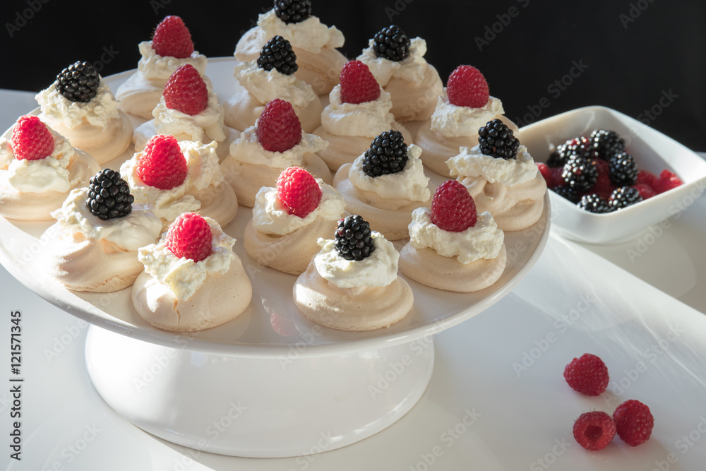 Talerz z mini bezami i kolorowe, letnie owoce