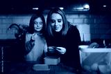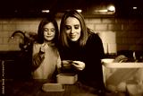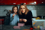 Mother and Daughter Enjoying Chocolate from a Casserole. Permissive mom is letting her kid have dessert before lunch time