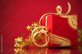 Red gift box with golden ribbons on red background. Merry christmas.
