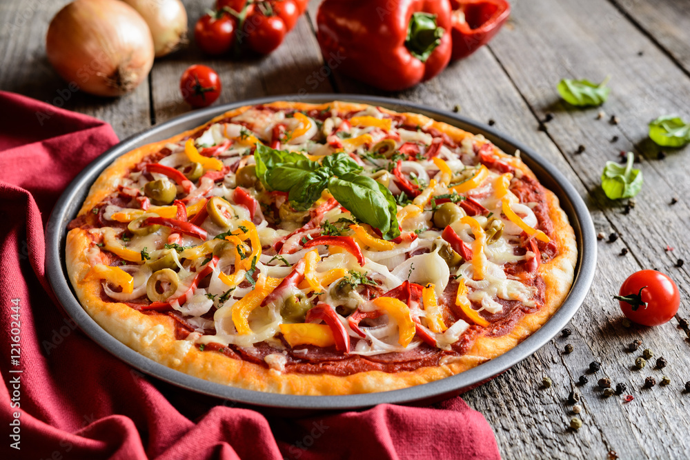 Salami pizza with green olives, pepper, onion and Edam cheese
