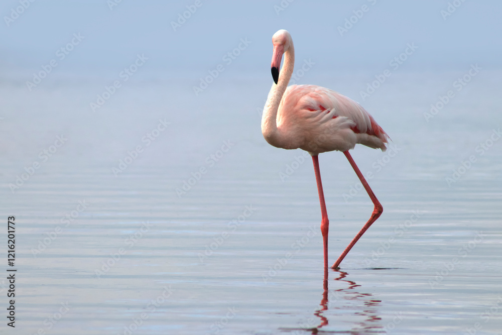 Wild African birds. A lone great African flamingo on a blue lagoon against a bright sky background