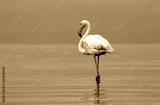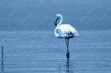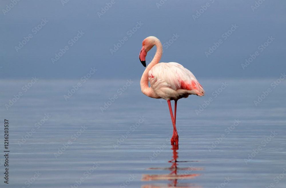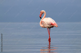 Wild african bird. Pink african flamingo on the blue lagoon on a sunny day
