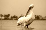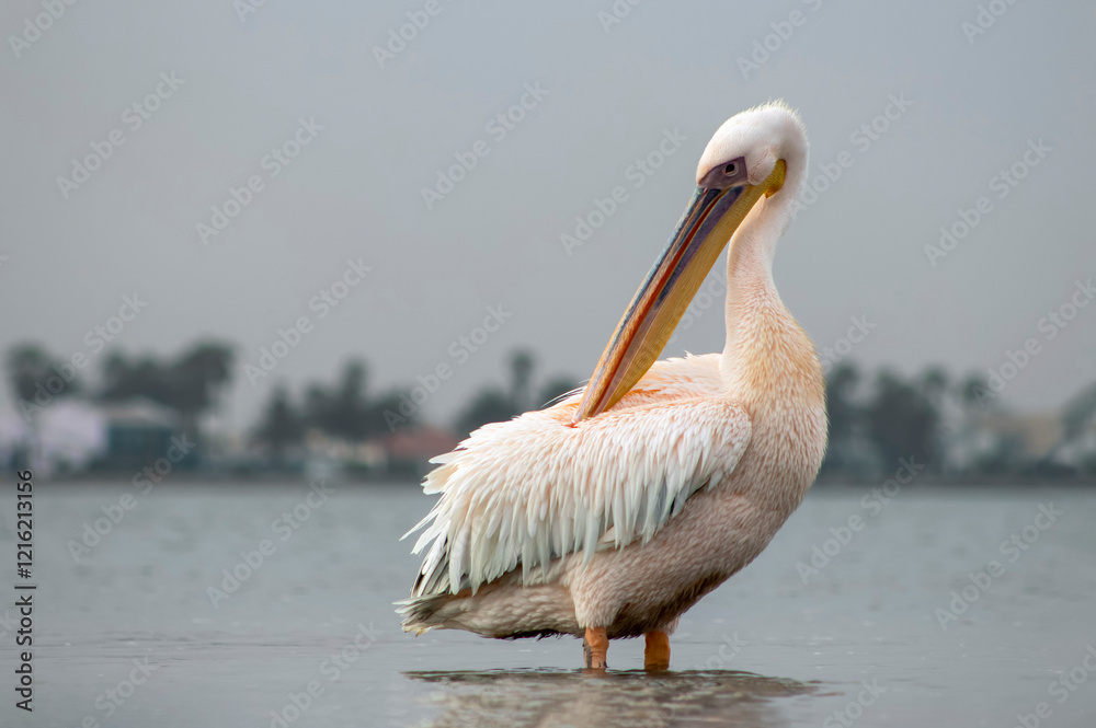 African wild birds. A lone white pelican on a blue lagoon on a sunny day