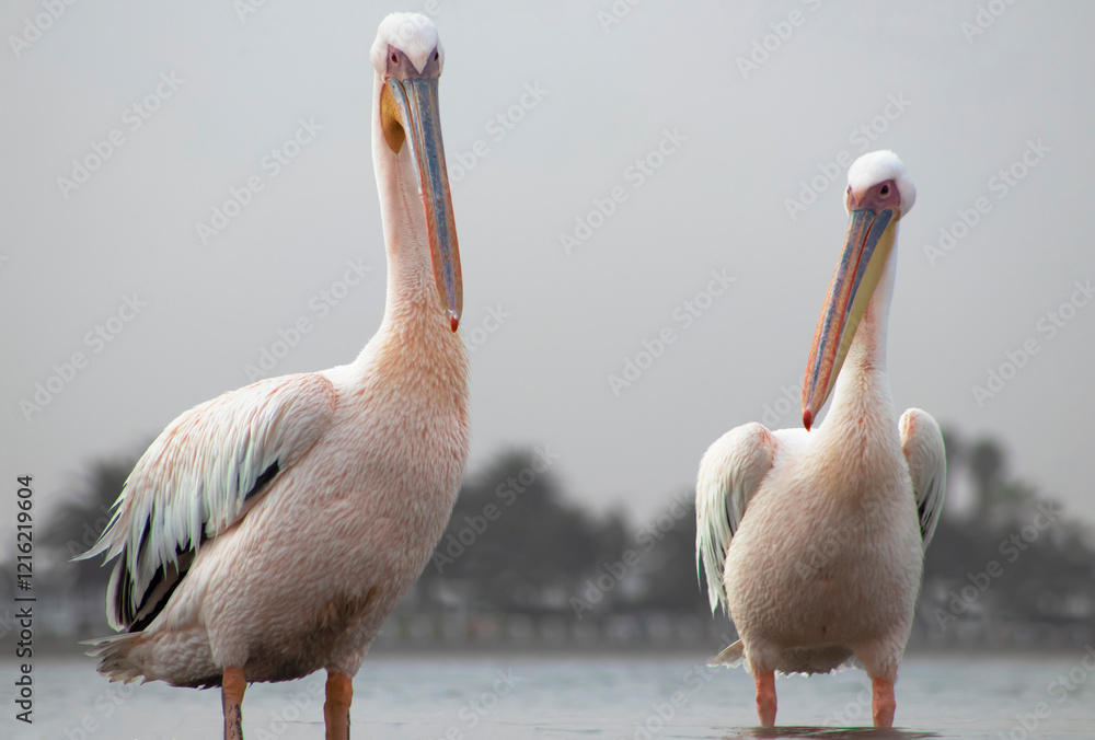 African wild birds. Great pelicans on the blue lagoon on a summer morning