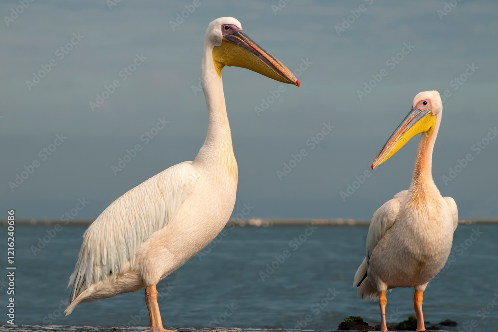 African wild birds. Great pelicans on the blue lagoon on a summer morning