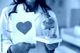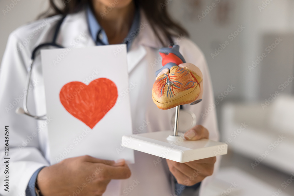 Take care of cardio health. Close up doctor hands hold drawing and anatomic model of heart. Cardiologist promote regular cardiovascular system checkup early diagnostic of cardiac diseases. Copy space