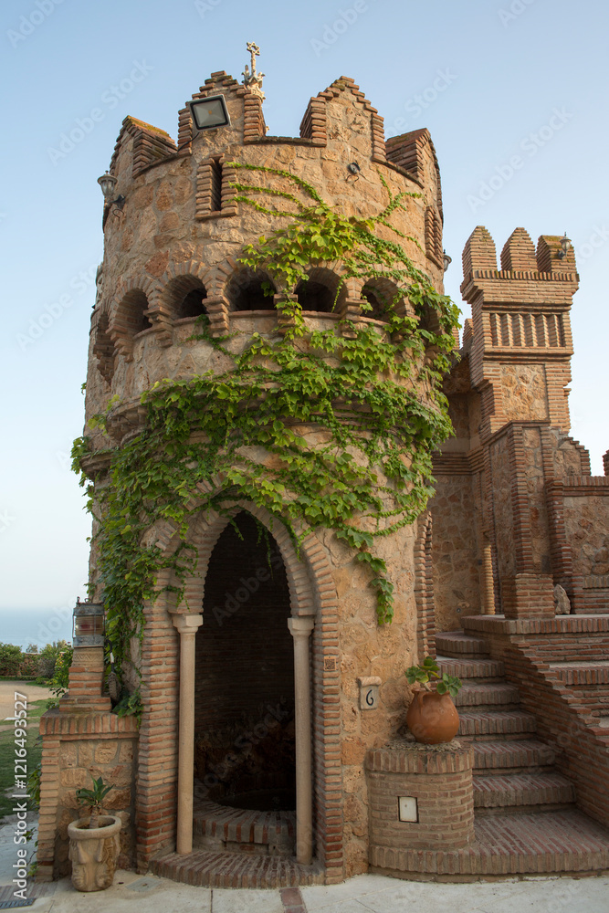 Closeup of a tower located in the Colomares Castle. It is a monument dedicated to Christopher Columbus and is located near Benalmádena, Andalusia, in Spain.