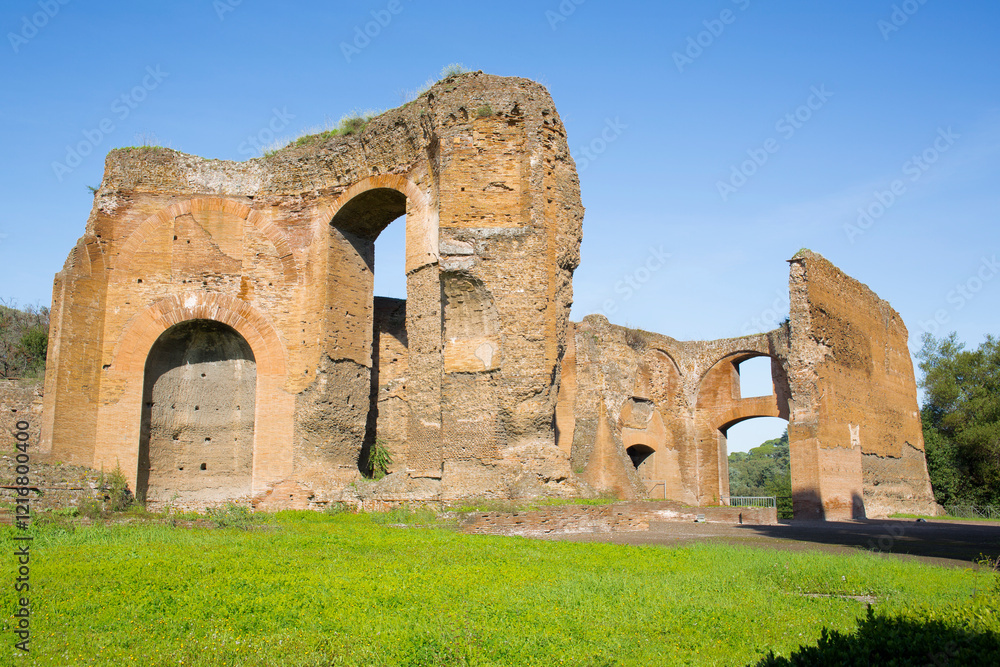 Roman ruins at the Baths of Caracalla located in Rome, Italy. Today this Roman public baths, or thermae, are a tourist attraction.