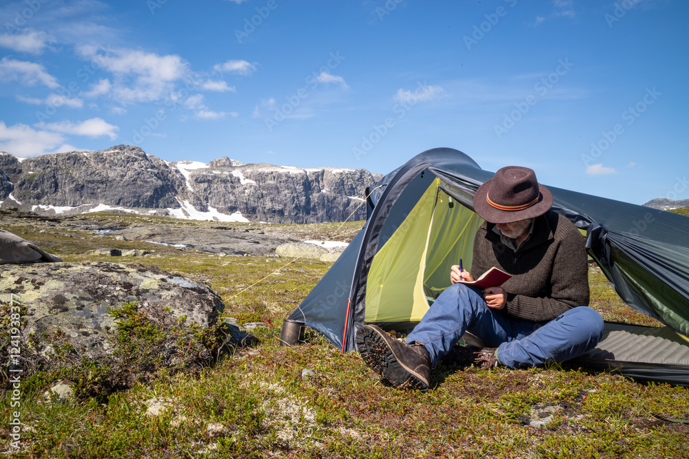 Coffee brewed on a firebox is poured into a wooden cup in a forest landscape