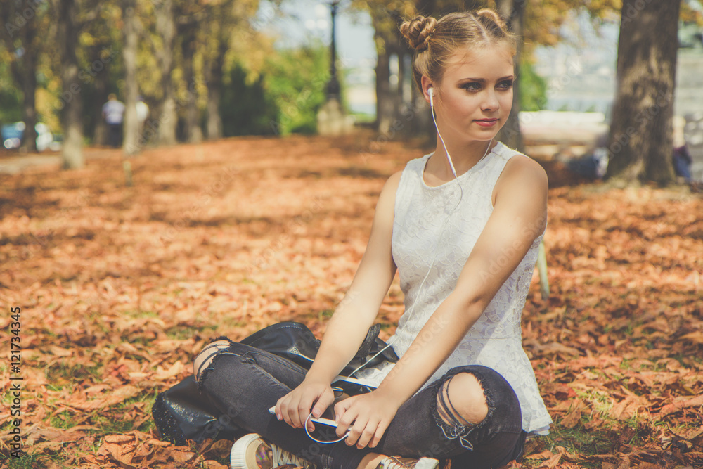 Girl is sitting with digital tablet outdoor