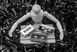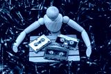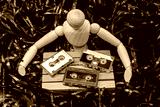 concept of the past, a wooden mannequin surrounded by unwound magnetic tape covers with hands an pallet of goods with audio cassette tape