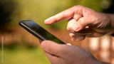 Closeup of man hands using a smartphone outdoors in a sunny garden.