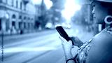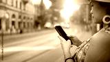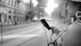 A stylish woman interacting with a smartphone near a tram station in Budapest