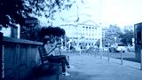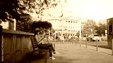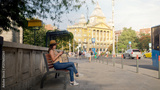 A woman sitting on a bench, browsing her smartphone on sunny street in Budapest