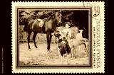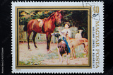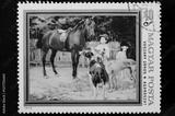 Postage stamp, Hungary, scenic painting with horse and dogs