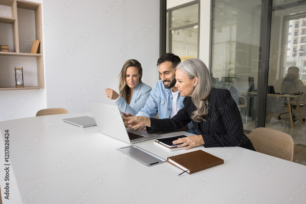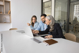Group of diverse businesspeople negotiate, collaborate on joint online project, developing marketing strategy, review new AI platform, take part in teamwork, brainstorming session in conference room