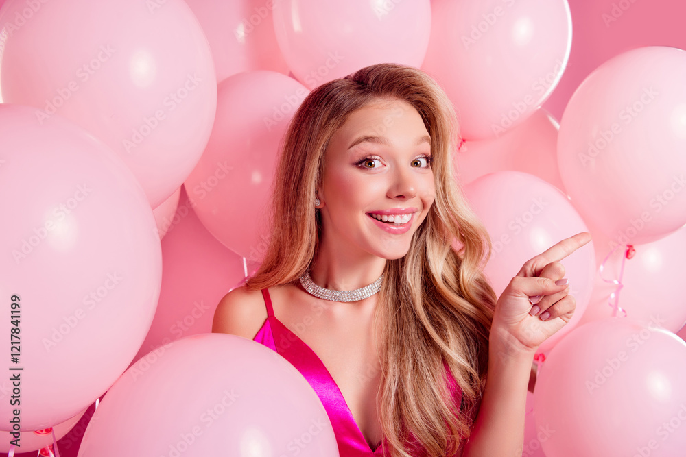 Charming young woman celebrating with pink balloons in glamorous style and elegant fashion