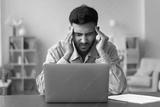 Information overload. Overworked too tired millennial man freelance worker sit at office desk by notebook with closed eyes rub temples suffer from headache overwhelmed with bad news of bankruptcy debt