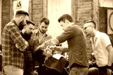 Teacher training group of students in beard shaving with metal straight razor in hairsalon. Interior shot of learning process in modern barbershop