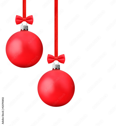 red сhristmas balls with bow hanging on a red ribbon clipping p