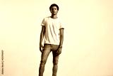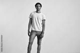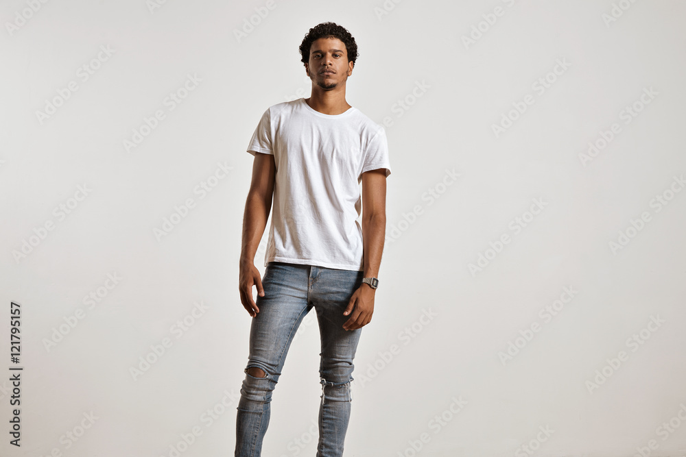 Full-body shot of an athletic attractive young male in ripped light blue jeans and blank white shortsleeve t-shirt