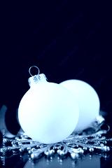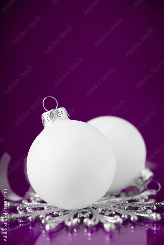 White and silver christmas ornaments on dark purple background with space for text. Merry christmas card. Winter holidays. Xmas theme.