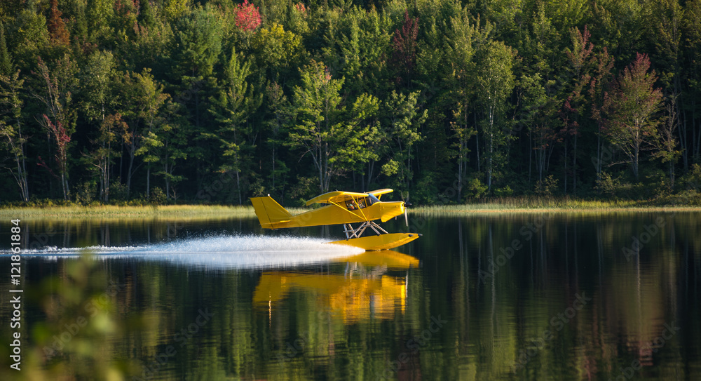 Small yellow airplane on pontoons takes off from an Eastern Ontario lake on a summer's evening.