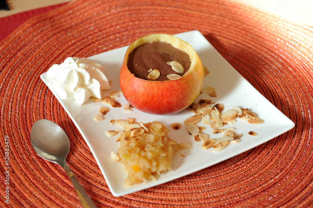 Red and yellow apples filled with chocolate and decorated with almonds.