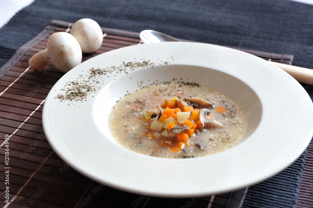 Soup with carrots, mushrooms and sour cream on a white plate and brown table top.