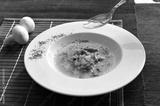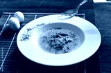 Soup with carrots, mushrooms and sour cream on a white plate and brown table top.