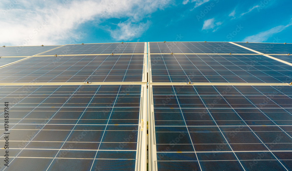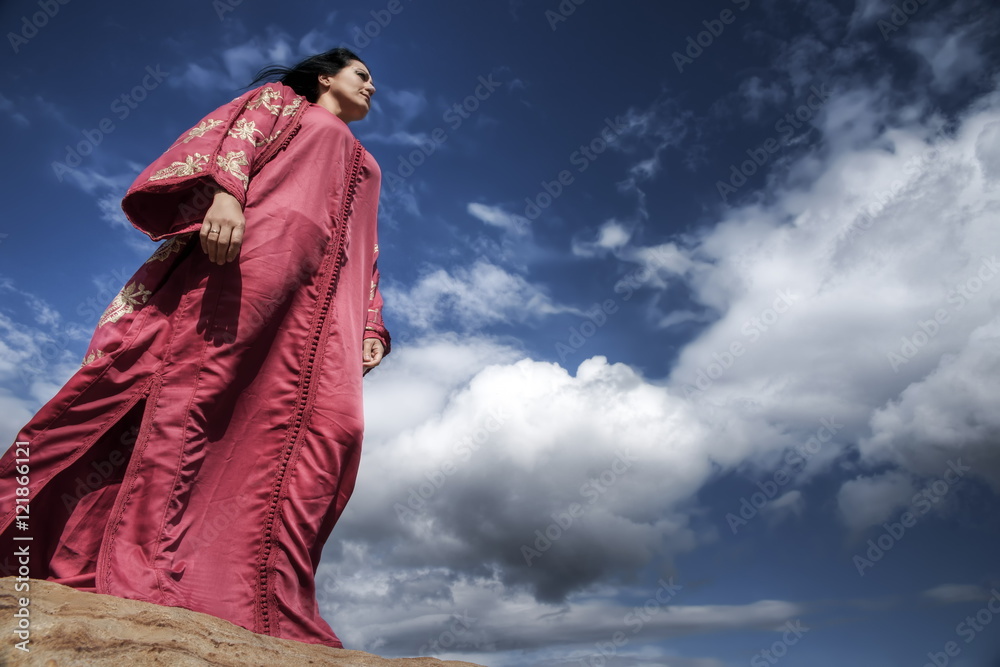 bonita mujer de rojo bajo un fondo azul lleno de nubes