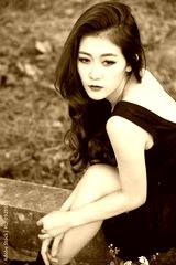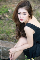 Beautiful asian woman in black dress sitting.