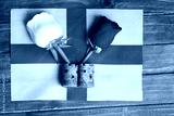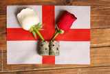 white and red roses on the background of the English flag. The concept of the war of the scarlet and white roses