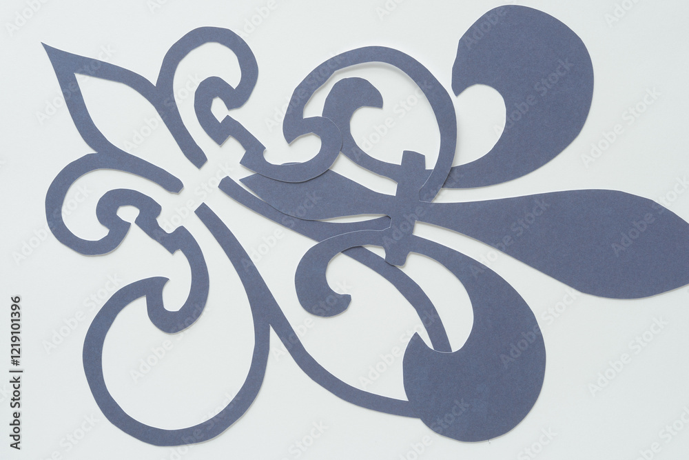 overlapping fleur-de-lys shapes machine-cut from blue paper on a blank surface