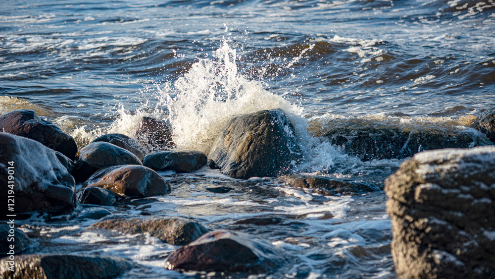 landscape with the seashore, windy winter day, water splashes, icy stones on the seashore, Baltic Sea, Latvia