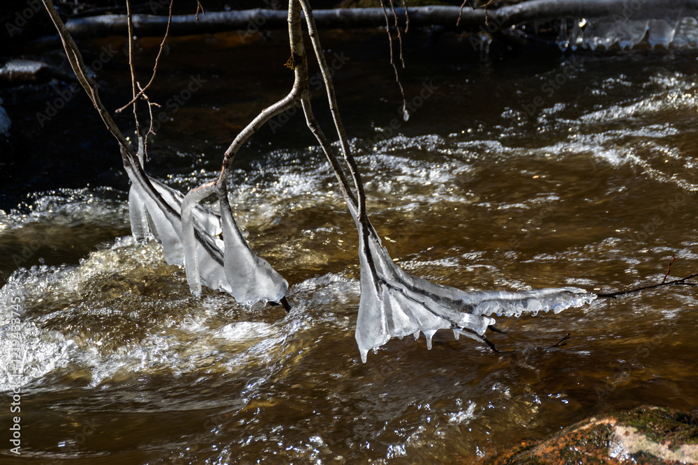 ice formations in a wild river, beautiful frozen ice formations from the interaction of water, flow and frost, Raunis, Latvia