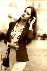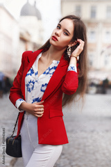 Female fashion concept. Outdoor portrait of young beautiful fashionable confident woman posing on the street. Model wearing stylish clothes. Girl looking at camera. Sunny day. City lifestyle. Waist up