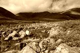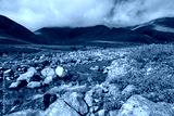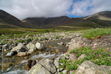 Summer Arctic landscape. A small river flowing in a mountain valley among the hills. On the rocky banks of the stream grows fireweed. Golden Ridge, Chukotka, Russia. Northern nature. Travel and hiking