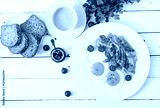 English breakfast - fried egg, tomatoes and bacon. Top view.
