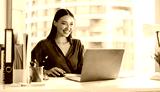 Smiling European female manager dressed in shirt sitting at her workplace in office, working on laptop computer, panorama, free space