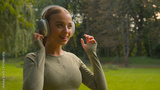 Happy sport girl runner jogger listen music in headphones in city park nature Caucasian woman turn on audio for sports training run running outdoors fitness exercise healthy lifestyle morning habit