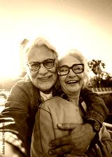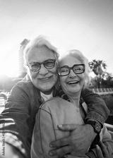 Vertical. Happy senior couple taking selfie outdoors in a park of the city. Smiling elderly people traveling together on vacation. Cheerful man and woman posing for photo with mobile phone.
