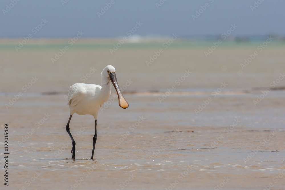 Common Spoonbill hunting on the beach (Platalea leucorodia), Fuerteventura
