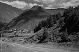 A mountain village in Georgia. A beautiful mountain landscape, a road and a settlement in the distance. Georgia's summer mountain landscape