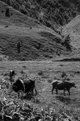 Cows graze in a meadow in the mountains. Mountain pasture in summer. Georgia in August. Against the background of a summer mountain landscape, beautiful green mountains