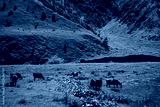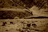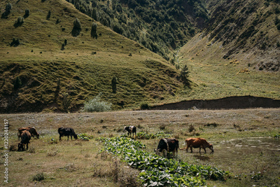 Cows graze in a meadow in the mountains. Mountain pasture in summer. Georgia in August. Against the background of a summer mountain landscape, beautiful green mountains