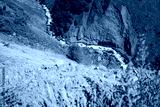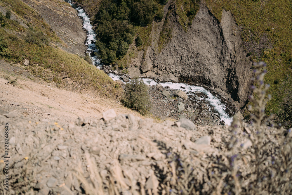 A turbulent mountain river in the gorge of the mountains of the North Caucasus in Georgia. Summer mountain landscape. A mountain river among the mountains. The gorge is high in the mountains