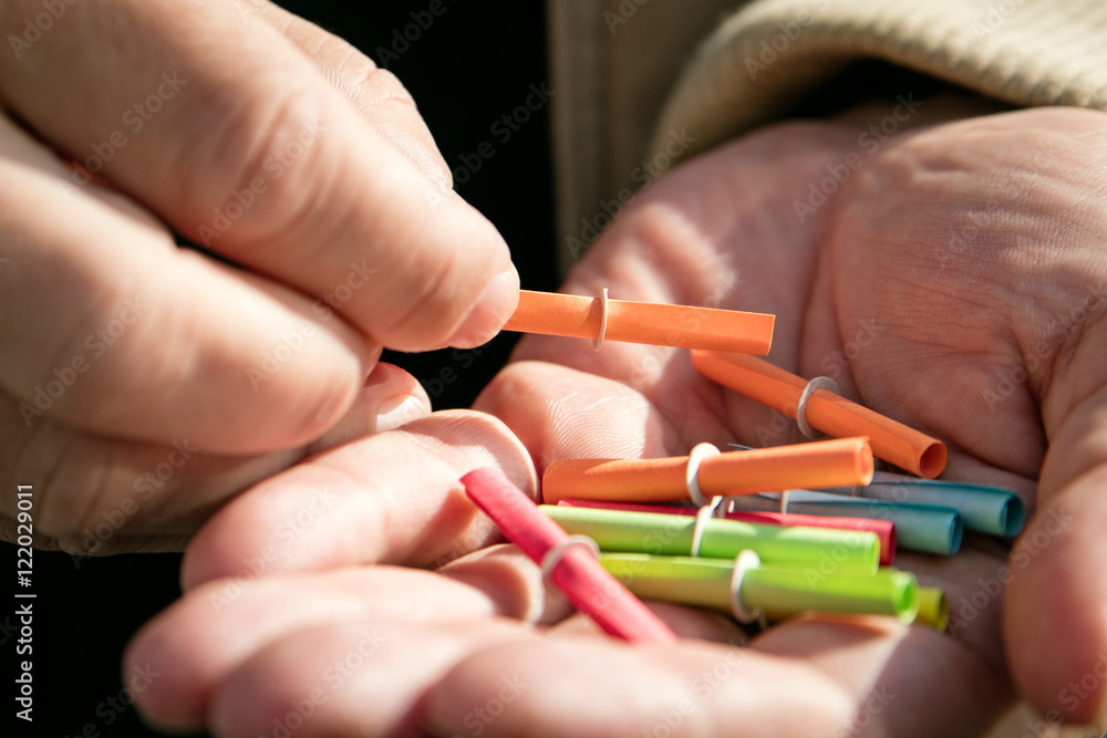 Nahaufnahme, Hand mit vielen bunten Losen, Tombola oder Lotterie